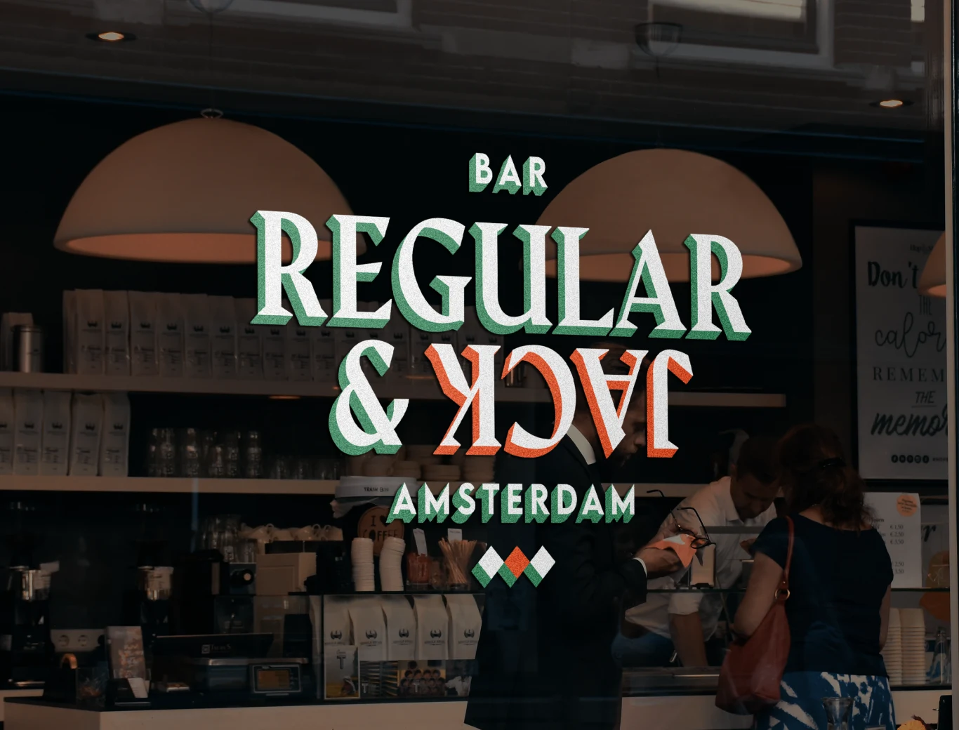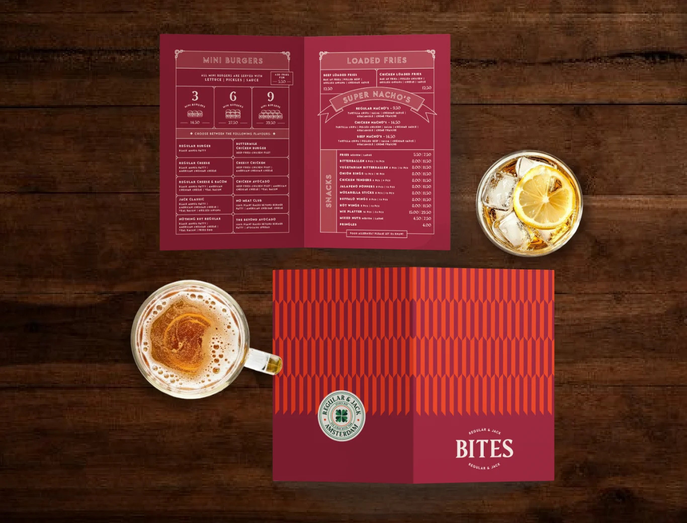 Voor Regular & Jack, een klassieke sports bar in hartje Amsterdam, ontwikkelden we een complete visuele identiteit – van logo en gevelontwerp tot menukaarten, coasters en merchandise. Het resultaat is een levendig, karaktervol merk dat de energie en gezelligheid van Ierse sports bars vertaalt naar een moderne Amsterdamse setting. Het voelde als thuiskomen – een unieke kans om hospitality branding te combineren met persoonlijk vakmanschap en oog voor detail.