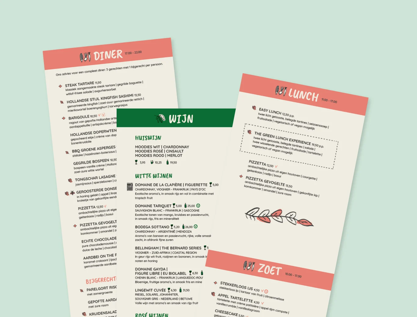 Some say that circular economy is the economic model of the future: a system in which we repaint, reuse and recycle as many products and raw materials as possible to minimize their destruction of value. For The Green House in Utrecht, a circular restaurant with its own Urban Farm full of fresh ingredients, we were asked to help visualize the design concept. We started with a series of illustrations to explain to visitors in an informal and playful way about their urban farm where they grow fresh herbs, use a 'plugless' kitchen, explain to them what is done with their leftover vegetables, and to make them aware to make sure that the choice they make, the guests, makes all the difference in making the world a better place. These narrative illustrations were used to create a background on the ground floor of the restaurant and translate it into a stationery that we printed on beautiful seed paper so that you can plant it after use and put a pot of flowers or herbs out of it to let grow. The menu encourages diners to make their choice based on its impact on the environment. We have developed a series of icons to communicate the place, health and carbon footprint of each dish on the menu. So next time you're wondering if you should order a bug burger or a hamburger? Know that your choice makes all the difference.
